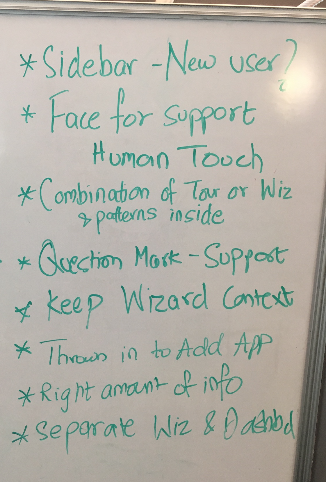 Brainstorming different patterns we could use to solve the top customer problems. We wanted to ensure that we align business objectives, time and budget constraints and come up with a strategy to help first time users without making any large changes in the current user interface.